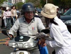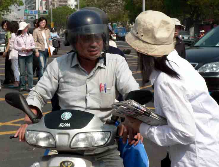 ![]() 过往群众停车索取揭露邪恶谴责中共罪行的资料 |