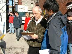 法轮功学员宣读了法轮大法信息中心的公告及加拿大法轮大法协会的公开信,呼吁加拿大政府、总理、国际社会及联合国来调查苏家屯集中营事件,对这种恶性事件進一步曝光,帮助停止这种野蛮和疯狂的虐杀。