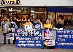 挪威法轮功学员在博德市市中心揭露和绝食抗议中共苏家屯集中营大规模虐杀法轮功学员的暴行。
