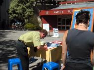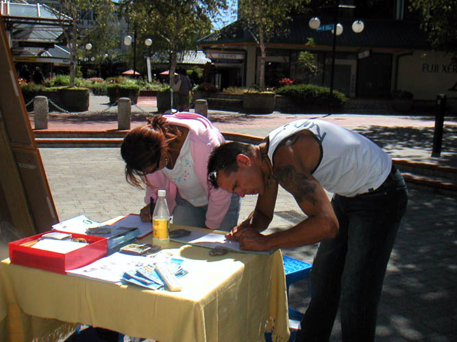 影画尚未完全上架就来了一对老年夫妇,看过照片后,老太太流着眼泪指着法轮功孤儿的照片对学员说:“好可爱的孩子,真是天使般的孩子。”然后拥抱着学员说,“你们干得好,请让全世界的人都知道真相,让我们对邪恶一起喊‘住手!’。”