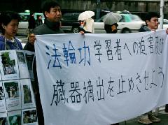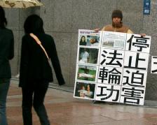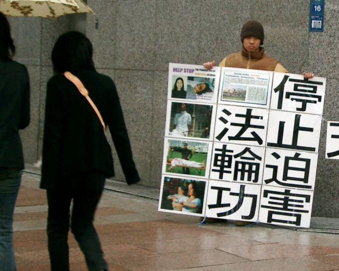 学员们冒着小雨,打着写有“停止对法轮功学员的迫害,停止对法轮功学员进行摘取内脏器官的暴行”的横幅,并举着写有“停止迫害法轮功”等字样的图片,向过往行人说明中共迫害法轮功的真相,及其所使用的流氓手段。过往行人无不被横幅和图片内容所震惊。