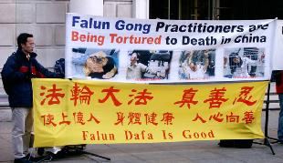 英国法轮功学员伦敦中共使馆前抗议苏家屯集中营暴行