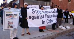 最后,学员们齐声对中领馆高声喊话:“法轮大法好!”“停止迫害法轮功,法办江泽民,法办罗干,法办周永康,法办刘京!”清澈响亮的声音表示了法轮功学员坚决的意志:不管迫害者现在如何丧心病狂,最后都将在正义的谴责、审判与严惩中偿还罪恶。
