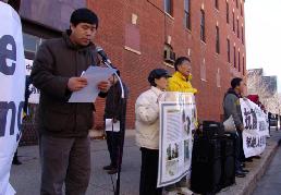 学员代表面对马路对面的中领馆说道:“希望中领馆的官员们,你们能够用自己的良知判断是非。如果你们愿意,我们可以在任何时间、任何地点以任何方式进行谈话。”