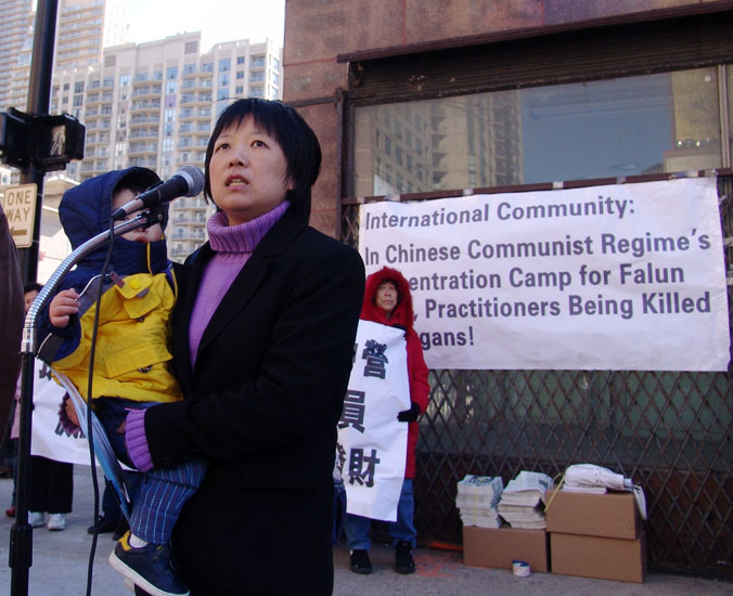 芝加哥法轮功学员张天啸女士携幼子参加了新闻发布会,并用中英文讲述了她的亲妹妹张云鹤至今下落不明、妹夫邹松涛因修炼法轮功而被迫害致死的真相。面对亲妹妹已经失踪四年多的事实,张天啸女士再次呼吁人们认清中共表面繁荣背后的罪恶,共同站出来抵制邪恶。