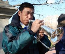 【明慧网2006年3月16日】(明慧记者李静菲报导)2006年3月15日,法轮功学员关贵敏在美国华盛顿白宫前的拉菲叶广场(Lafayette Square)吹奏小号,呼唤民众关注“苏家屯”秘密集中营的暴行。身为著名歌唱家的关贵敏说,他要用自己力所能及的方式呼唤良知正义,制止中共的残酷暴行。