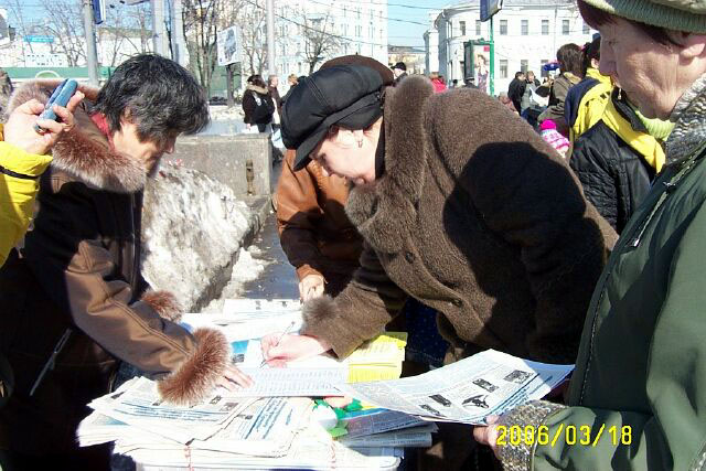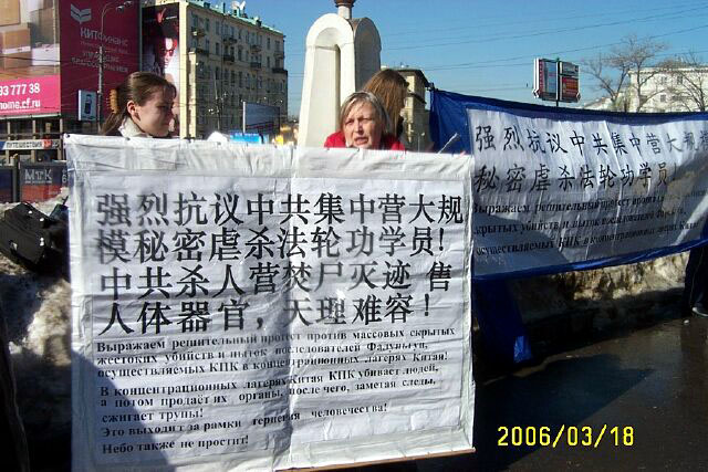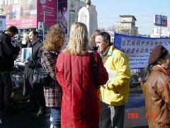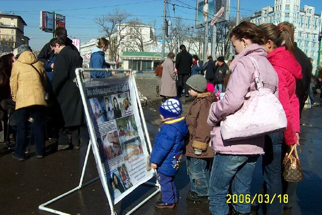 连日来,俄罗斯法轮功学员积极向各级政府、人权组织、各大媒体、广大的俄罗斯人民和当地的中国人讲清真相,把中共苏家屯杀人营的罪恶曝光于天下。法轮大法学会给普京总统写了呼吁信。并在中国人集中的市场、学校、宾馆发放了大量的真相资料和《九评共产党》。今天又在莫斯科街头向广大莫斯科市民揭露中共邪党的罪行。人们看到真相材料都不敢相信是真的,可这确是实实在在的事实。