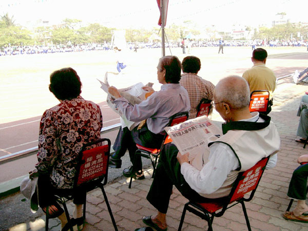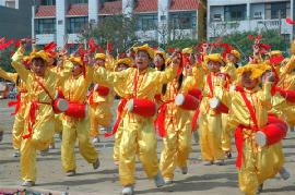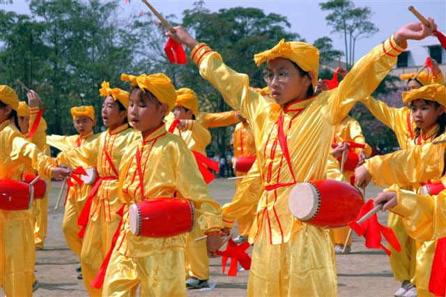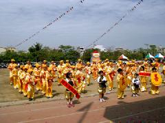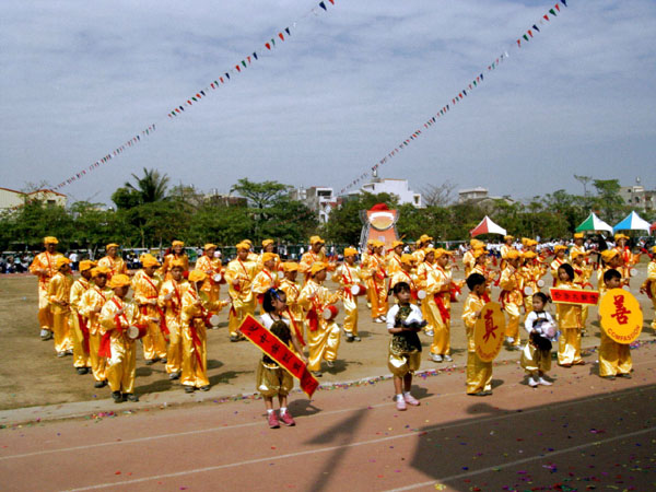【明慧网2006年3月19日】2006年3月18日,台南县新营市新进国小举行创校五十周年庆祝活动,法轮功学员组成的腰鼓队应邀参加,这支当天唯一来自校外的表演队伍,赢得包括县长、教育局长、立法委员在内的观众与家长们一致好评。依往年惯例,校庆运动会的表演团队几乎全部是由新进国小的学生组成。今年由法轮大法小弟子组成的腰鼓队,搭配十几位学员,整齐醒目的服装、整齐划一的演出,给人耳目一新的感受。
