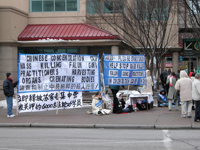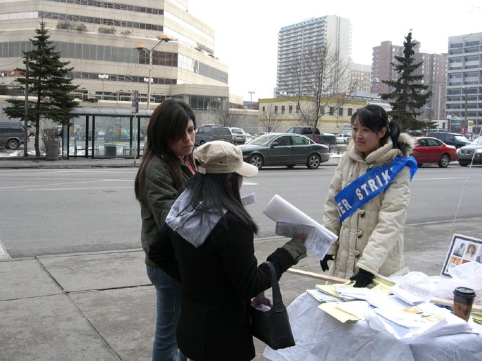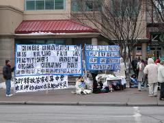 学员们刚刚在唐人街挂好横幅就过来一位大妈问发生了什么事情, 一位学员指着横幅标语告诉她沈阳苏家屯发生了令人发指的杀人惨案,大批法轮功学员被虐杀,他们的器官被摘除。“哎呀,妈唉,苏家屯离我们那旮达不远,怎么能有这种事呢?”那位学员说:“共产党什么事干不出来,这么多政治运动,您肯定经历了不少。” “嗨,我们家就有人被抓,被杀呢!”大妈话音刚落,这位同修就想起了很多次的讲真相活动,几乎每次都能碰到愤愤不平的人们拉着法轮功学员倾诉他们遭受的迫害,对中共暴政的痛恨。另一位老太太看了展板后主动要了许多传单,说要告诉其他的人,替学员们把传单发给那些还不知情的人。