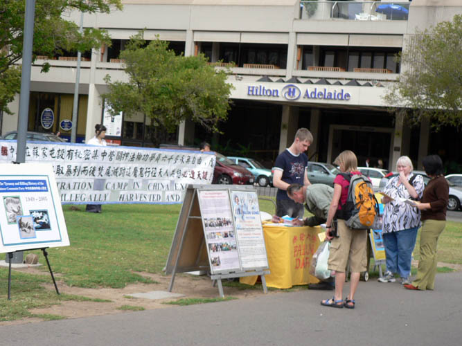 阿德雷德是中国学生留学澳洲的联系站,近几年来了不少青年学生。刚来的他们大多躲着法轮功的洪法点走,现在他们不同了,当学员在跟别人讲真相谈到在中国不能炼法轮功时,一位青年中国留学生证实的说,在(中国的)街上拿着法轮功的资料都会被警察抓起来。有的学生还帮助法轮功学员发真相资料。