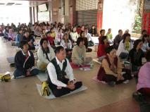 迎头开道的是三位身着黄色炼功服,手持“真”、“善”、“忍”绣牌的法轮功学员,随后是三面绣着法轮的巨大彩旗,紧接着是三十余位学员组成的腰鼓队和法轮大法洪传世界的彩幅。祥和美好的气氛令人赞叹:“原来这就是法轮功!”。