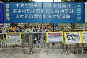 ![]() 香港法轮功学员22日在立法会大楼外绝食抗议、谴责中共秘密设置苏家屯集中营 |