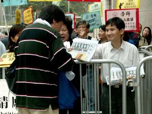 ![]() 法轮功学员在立法会大楼外的示威区,向出席财政预算案辩论的议员、三司十一局高官递交请愿信及苏家屯惨案特刊。图为职工盟李卓人议员接收请愿信及特刊 |