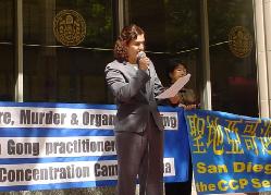3月21日中午,圣地亚哥法轮功学员和各界人士在市政厅前举行新闻发布会,揭露中共苏家屯秘密集中营活体摘取法轮功学员器官并焚尸灭迹的兽行,并声援九百万勇士退出中共党团队组织。