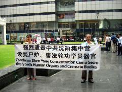 2006年3月23日,新加坡法轮功学员在金融中心摆放展板揭露中共抗议中共秘设苏家屯集中营关押法轮功学员并活体摘取器官、焚尸灭迹的法西斯的行径,中共的法西斯罪行令过往行人无比震惊。