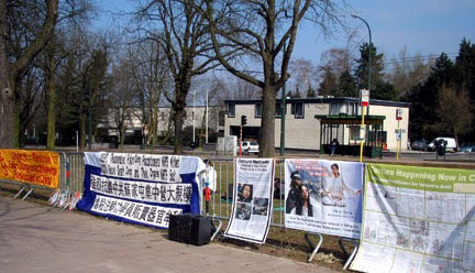 学员们不断播放有关苏家屯集中营活体摘取法轮功学员器官的消息和对两位证人的采访报导,以及1000多位法轮功学员家属向国际社会发出的营救受迫害中的法轮功学员的呼吁。