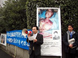 3月23日中午,日本法轮大法学会在日本国会前举行记者招待会,揭露中共苏家屯集中营暴行,随后致请愿信于日本首相小泉纯一郎,希望日本政府帮助制止迫害法轮功、救援苏家屯被非法关押的法轮功修炼者,并强烈抗议中共兽行。