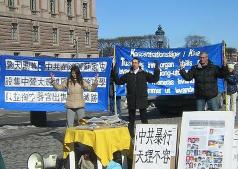 2006年3月25日中午,瑞典斯德哥尔摩及周边城市的法轮功学员来到市中心钱币广场呼吁民众关注中共苏家屯秘密集中营对法轮功学员的虐杀。