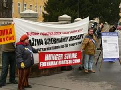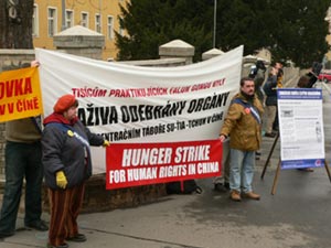 【明慧网2006年3月28日】2006年3月25日上午10点,捷克法轮功学员在布拉格中使馆前开始24小时绝食,抗议中共沈阳苏家屯集中营杀害法轮功学员的暴行。