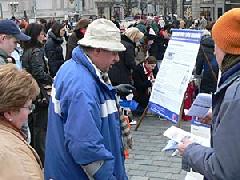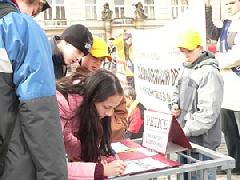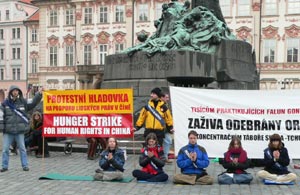 下午3点,绝食地点转移到市中心旅游景点-旧城广场的“扬·胡斯”铜像旁边。竖起的横幅上写着“几千法轮功学员在中国苏家屯集中营被活体摘除器官”,还有相关事件介绍。学员在广场上发真相传单和征集促请捷克总理和政府要求国际社会对苏家屯事件进行调查和制止迫害法轮功的请愿签字。