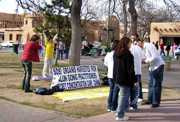 【明慧网2006年3月29日】2006年3月25日,来自美国新墨西哥州圣塔菲(Santa Fe)、阿尔伯克基和洛斯阿洛莫斯的法轮功学员在圣塔菲市的著名旅游景点—圣塔菲广场举办了揭露中共邪党在苏家屯集中营血腥罪行的活动。活动引起了许多当地居民和游客对法轮功学员在大陆境遇的关注。