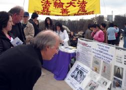 来自中国大陆的游客在法国看到法轮功学员自由的炼功,很惊异。他们默默的看着,在揭露中共恶党秘设苏家屯集中营的图片前停留,从他们惊讶表情中可以看到他们内心的震动。