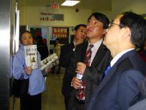 在场外抗议的法轮功学员在大楼走道中向王英及其随行人员递发海外媒体对苏家屯事件的报导,并通过扩音器向他们揭露在苏家屯发生的暴行。