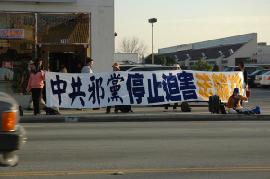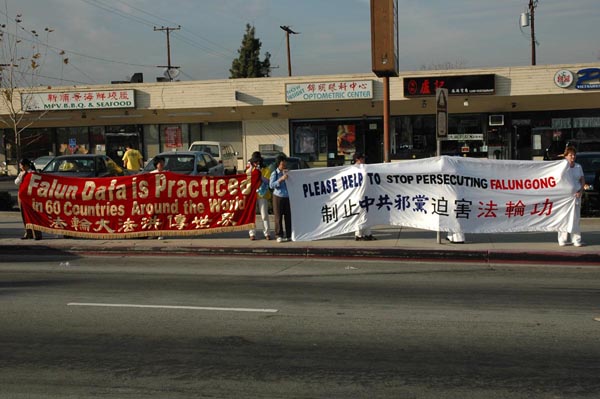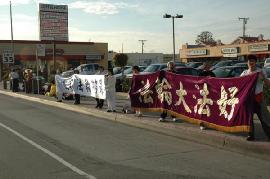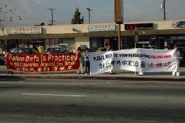 午后的阳光灿烂,法轮功学员展开各式横幅,人们被吸引,被震惊,许多民众开车趋缓并摇下车窗,瞪大眼睛看着展板内容。另有的轻鸣喇叭以示鼓舞、赞同,或翘起大拇指说“That’s good!”