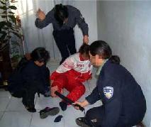 酷刑电击图56此种酷刑即是强迫法轮功学员赤脚坐在水泥地上,恶警王乃民、张秀荣、王淑红、黄海艳用电棍轮换电击法轮功学员的脚心、两臂、双腿、后背、脸等身体敏感部位。
