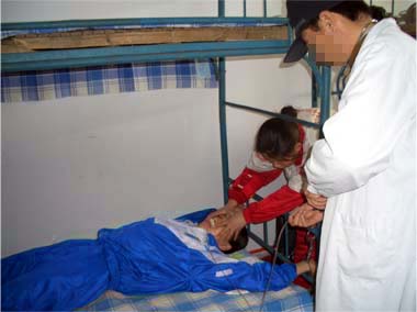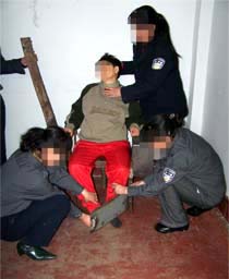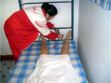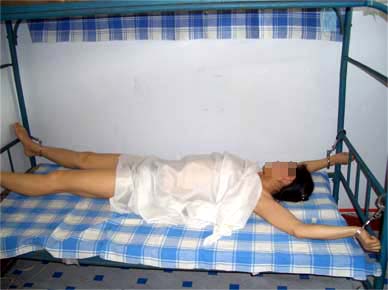 此种酷刑即是将长期绝食的法轮功学员扒光衣服,呈“大”字型裸铐在铁床四角,身上仅盖一棉被,手脚都被勒得有血印,然后强制鼻饲。这种酷刑污辱性极强,使人身心严重受挫。本溪法轮功学员周玉芝(40多岁),被恶警张秀荣、周谦、齐福英、张鹤、管琳等拖到值班室的死人床上灌食,疼得她满地打滚,灌食后没有味觉与嗅觉,身体衰弱,几个月后仍被送到严管队迫害。大连法轮功学员李平,因绝食被恶警王秀菊及其犹大扒光衣服铐在床上,长期灌食,四个月后,人瘦得的只剩一副骨架,后被秘密送走。
