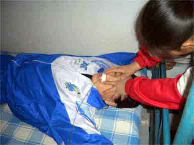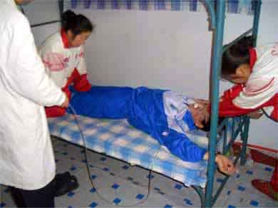 此种酷刑即是将长期绝食的法轮功学员呈“大”字型铐在铁床四角,四肢均悬空,恶警把乳胶管的一端插入鼻孔,经食道入胃内,另一端用注射器抽取玉米糊、烂菜汤注入体内。动作粗暴、野蛮,导管戳破鼻腔、食道、胃壁,导管上都是鲜血。有的法轮功学员被戳破胃壁,导致胃长期出血。由于长期绝食,胃体已经收缩,一次注入合计1000毫升的玉米糊和水,会使胃体突然膨大,疼痛难忍,造成法轮功学员小便失禁,或小便频繁,频繁者最多一小时15次。长期受此迫害,会出现厌食、恶心,吞咽困难,有的鼻饲管不拔,长期粘在法轮功学员脸上,留在胃中的管在胃内烂掉,恶警嘲笑:“看你长个长鼻子,变成大象了。”