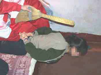 此种酷刑即是将法轮功学员按在床上,腰部以上悬空,探在床外,几个犹大压住腿,双臂反背过去铐上,恶人拿鞋底、笤帚使劲打头部、后背,受此刑时间一长腰部就象折了一样,承受不住稍一低头,犹大就抓头发打。