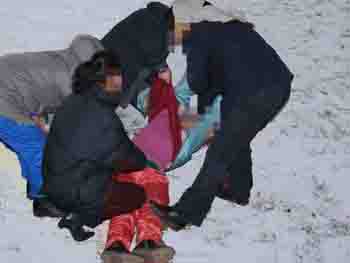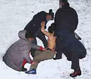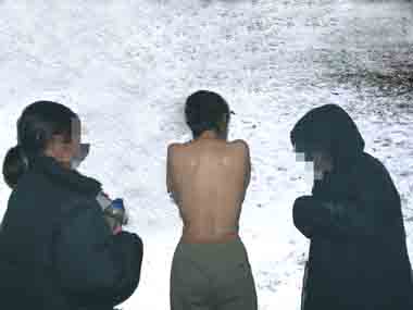 此种酷刑是在寒冷的冬季,扒光女法轮功学员的上衣,只剩一条衬裤,然后摁倒在冰冷的雪地里,从早晨一直冻到深夜,不准進屋,受刑者手脚都被冻成了黑紫色。