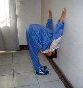 ![]() 演示图:“挂”在墙上 | ![]() 演示图:恶警犯人暴打法轮功学员 |
