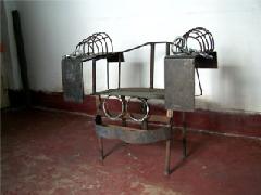 铁椅子,顾名思义,是用金属焊接而成,马三家的铁椅子分两种,环式铁椅子和板式铁椅子。如下图57、58是环式,图59是板式。由于材料有限,图示仅是法轮功学员仿制的模型,教养院体罚法轮功学员实际的铁椅子比模型要厚重的多,需由几个人才能抬动,凡是不转化的,不配合其它酷刑迫害的,就给你长期固定在此铁椅子上,人坐上之后,双手、双脚、腰全被铁环、铁板、手铐固定住,几小时后手、大腿、脚全部浮肿。恶警还不时地用电棍击或暴打法轮功学员。