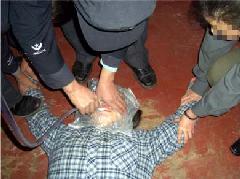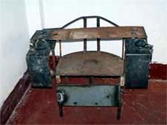 此种酷刑即是将法轮功学员关在小号里,强迫坐铁椅子。法轮功学员的双臂、双脚都用铁环扣上,手上手环。几个恶警同时用电棍电击法轮功学员的颈部、下颌、面部和腹部等敏感部位,反复电击。如不转化、写三书,这样的酷刑不间断。被电击的法轮功学员满身是焦糊的伤口,伤口和衣服粘在一起。受刑者极其痛苦又不能动。有的法轮功学员受此刑后头发散乱,意识模糊。有的法轮功学员由于长时间这样一个姿势坐着,屁股上的肉已经逐渐坏死溃烂,流脓淌血,裤子被脓血粘在一起结成痂,脱不下来,只好用剪子把裤子剪破。上此酷刑者每天只许早晚各去一次厕所,有时尿憋不住只得往裤子里尿。恶警们把法轮功学员一铐就是一周和十几天。有的法轮功学员放出来时,两只胳膊不好使,两条腿不能走路,有的四肢都不能动,只能用担架抬回来。