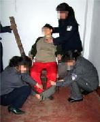 此种酷刑即是将长期绝食的法轮功学员扒光衣服,呈“大”字型裸铐在铁床四角,身上仅盖一棉被,手脚都被勒得有血印,然后强制鼻饲。这种酷刑污辱性极强,使人身心严重受挫。本溪法轮功学员周玉芝(40多岁),被恶警张秀荣、周谦、齐福英、张鹤、管琳等拖到值班室的死人床上灌食,疼得她满地打滚,灌食后没有味觉与嗅觉,身体衰弱,几个月后仍被送到严管队迫害。大连法轮功学员李平,因绝食被恶警王秀菊及其犹大扒光衣服铐在床上,长期灌食,四个月后,人瘦得的只剩一副骨架,后被秘密送走。