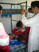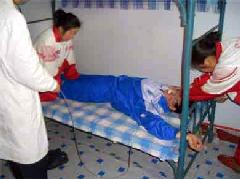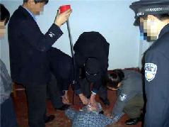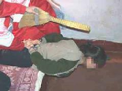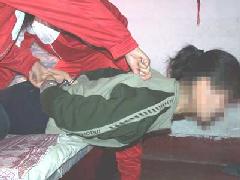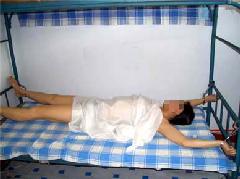 此种酷刑即是将法轮功学员按在床上,腰部以上悬空,探在床外,几个犹大压住腿,双臂反背过去铐上,恶人拿鞋底、笤帚使劲打头部、后背,受此刑时间一长腰部就象折了一样,承受不住稍一低头,犹大就抓头发打。