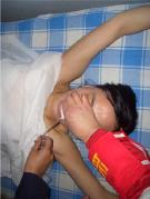 此种酷刑即是将长期绝食的法轮功学员呈“大”字型铐在铁床四角,四肢均悬空,恶警把乳胶管的一端插入鼻孔,经食道入胃内,另一端用注射器抽取玉米糊、烂菜汤注入体内。动作粗暴、野蛮,导管戳破鼻腔、食道、胃壁,导管上都是鲜血。有的法轮功学员被戳破胃壁,导致胃长期出血。由于长期绝食,胃体已经收缩,一次注入合计1000毫升的玉米糊和水,会使胃体突然膨大,疼痛难忍,造成法轮功学员小便失禁,或小便频繁,频繁者最多一小时15次。长期受此迫害,会出现厌食、恶心,吞咽困难,有的鼻饲管不拔,长期粘在法轮功学员脸上,留在胃中的管在胃内烂掉,恶警嘲笑:“看你长个长鼻子,变成大象了。”