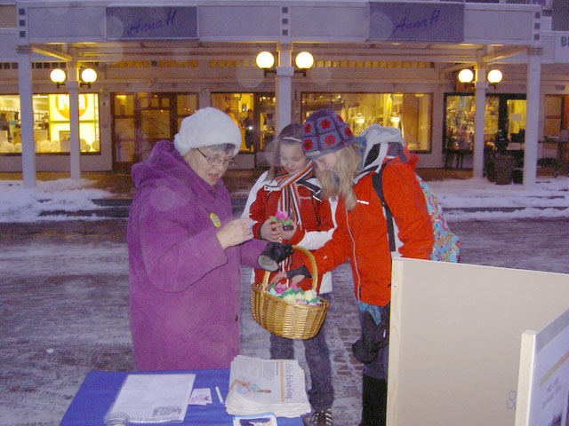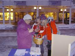 虽然很冷,仍然有许多人取走了简介。有一位女士向学员走来,并且表示能看到法轮功真是件很巧合有趣的事,因为在当天稍早,她与同事曾上网找寻法轮功的信息,她们想要知道可以学功的炼功点。学员提供给她最近的炼功点信息,她高兴的离开了。