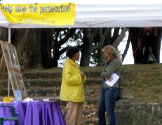 来自挪威的一位国际学生说,她了解法轮功很好,但不知道为什么她的中国同学中仍有几个对法轮功有偏见。学员告诉她中共的谎言毒害了很多人,并向她介绍中共制造天安门自焚伪案,并列举出许多疑点。这位学员讲了自己在中国国内的亲属不修炼都受监控的事实后,那个挪威学生气愤的说:“我不知道用什么语言来形容中共的暴行。好在许多中国人出国之后,通过亲身感受,知道了中共在撒谎。”她说:“我有几个中国的同学对我说,他们坚决不想回中国,因为他们以前所相信的中共的宣传全是假的。”