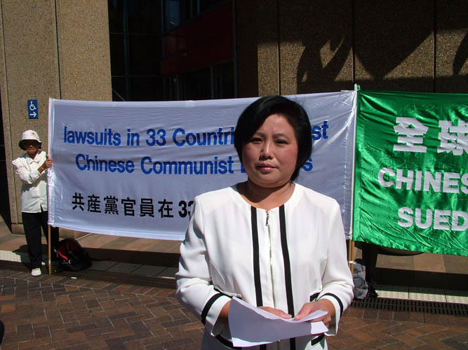 【明慧网2006年3月8日】2006年3月7日上午,华裔画家、法轮功学员章翠英女士在澳洲纽省高等法院前举行新闻发布会,向媒体披露她起诉迫害法轮功的元凶、原中共总书记江泽民以及“610”办公室一案的最新动态。自由记者理查•萨宝也在新闻发布会上发言,向媒体公布他通过自由资讯条例从外交部得到的一些文档。其中披露了在中共黑手操控下,澳洲外交部失职和没有坚持原则,有意拖延案子,这些资料也印证了前中领馆官员陈用林曾经披露过的内幕――澳外交部在中共压力之下在诉讼案中私下给中方提供帮助,为虎作伥。