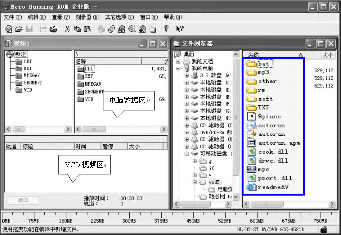 制作方法请参考VCD和电脑两用光盘的制作,简述如下,将完整目录(蓝色方框内)拖到“电脑数据区”,将九评片头等在VCD上看的视频拖入到“VCD视频区”,光盘总容量尽量不要超过650即可。