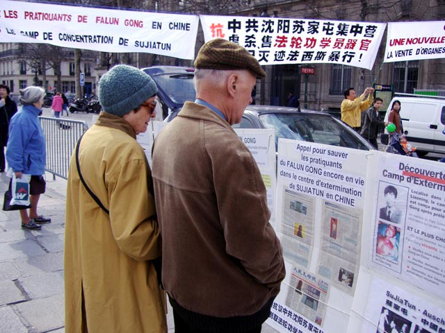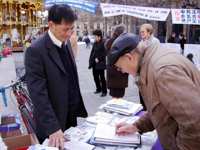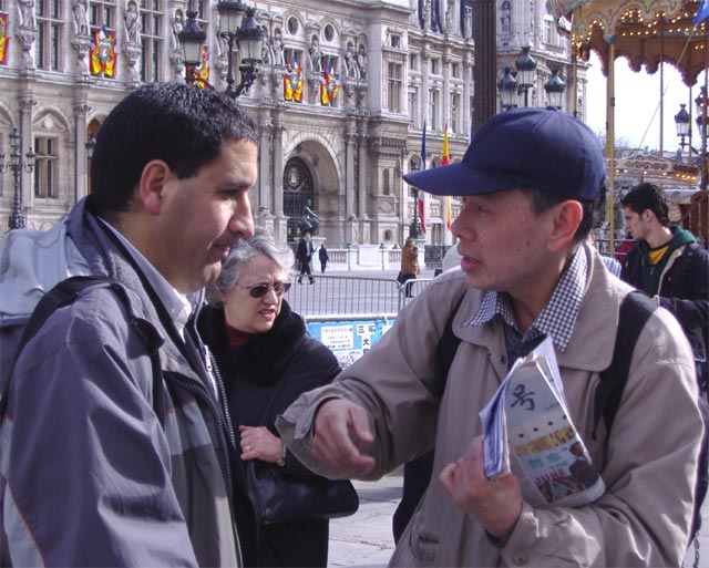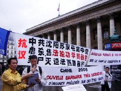 【明慧网2006年4月1日】法国法轮功学员于2006年3月29日、30日下午3点分别在巴黎市政府(L.Hotel de Ville)和La Bource广场法新社(AFP)和法国股票市场所在地前,用广播、展板图片、征签和发送真相资料的方式向法国民众揭露中共苏家屯集中营的罪恶,强烈抗议中共设立苏家屯秘密集中营群体虐杀法轮功学员、活体摘除法轮功学员器官并焚尸灭迹的罪恶行径。同时呼吁法国政府、媒体和民众关注、并一起制止中共对法轮功学员的虐杀和紧急营救正在苏家屯集中营遭受迫害的法轮功学员。