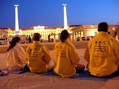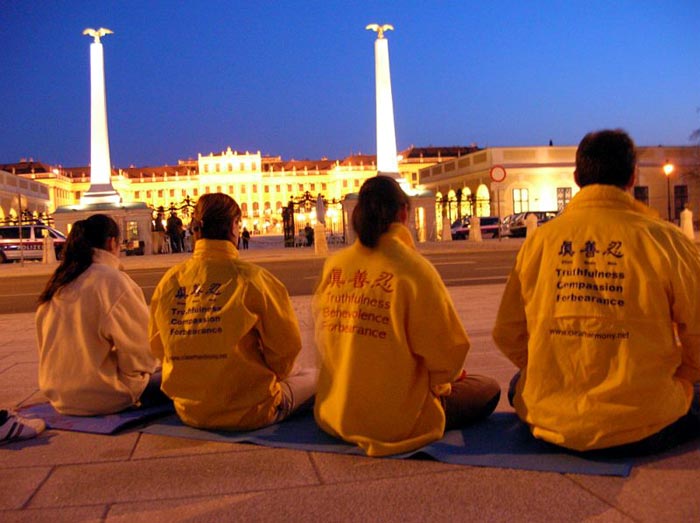 4月8日晚,法轮功学员们又到了下一个会议的地点,著名的夏宫——美泉宫Schoenbrunn。在皇宫正门的对面,学员们举着横幅和标语,炼着祥和的功法。一辆辆车,载着赴会的代表,缓缓的从学员身边驶过。车上的人都睁大眼睛看着学员关于“中共苏家屯集中营活体摘取法轮功学员器官”的横幅。本来这次活动申请在晚上7点30分,但执勤的警察特意告诉学员要7点到,否则就太晚了。