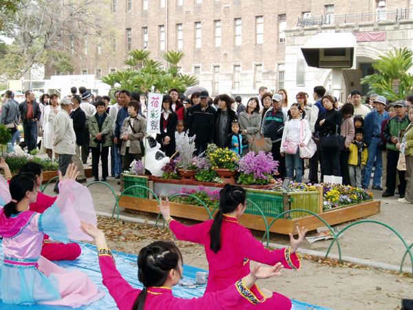 2006年4月8日和9日,上百万游客涌入大阪城公园观赏樱花绽放。当天法轮功学员表演了仙女舞并演示了法轮功功法,受到游客热烈欢迎。一位游客说:以前曾接到过法轮功的传单,原来以为法轮功只是一个受迫害的群体,没想到法轮功竟是这样的美好祥和。一些游客也模仿着法轮功学员炼功。有的甚至感到身体非常舒服,感叹功法的神奇。