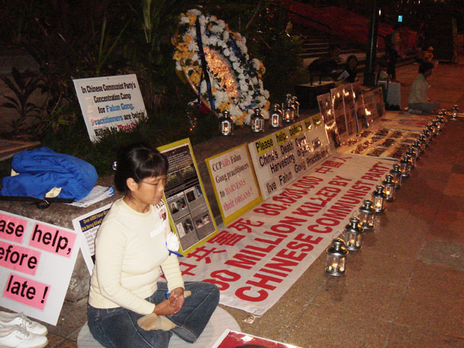 接着学员们点燃烛光灯,开始烛光守夜,抗议迫害并悼念遭中共迫害致死的同修。在车水马龙嘈杂的闹市当中,这无声的正义呼吁显的越发庄严肃穆。