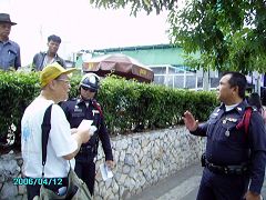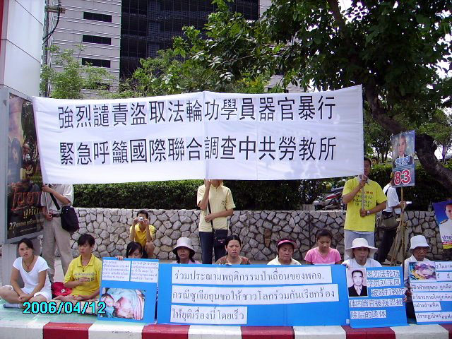 【明慧网2006年4月13日】2006年4月12日上午,泰国法轮功学员在中使馆对面,抗议中共大规模秘密杀害法轮功学员,活体摘取器官并焚尸灭迹的滔天罪行,打出了“强烈谴责盗取法轮功学员器官暴行,紧急呼吁国际联合调查中共劳教所黑幕”、“法轮大法好”、“真善忍”等横幅,并摆放揭露法轮功学员被中共酷刑迫害的泰中文展板,向来往行人展示真相。