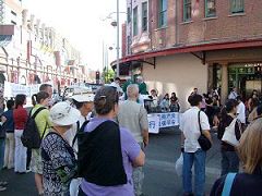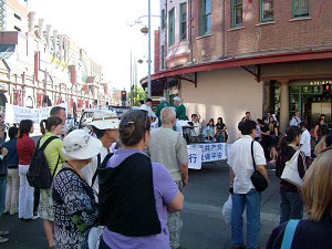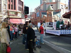 集会后,人们在警车的开道下举行封路游行,游行队伍分为反迫害、鼓阵、九评、退党及大纪元旗阵五个方阵,从贝尔莫公园游行穿过市中心至唐人街。众多的标语,威武旗阵、鼓队和一路的口号声使近1千万有志人士退出中共及其所有体系的消息快速传播至街头两边的民众。游行终点处,还现场表演了一个短剧,揭露中共集中营活体摘除法轮功学员器官出售的血腥事实,中共集中营、各大劳教所迫害法轮功学员的灭绝人性的恶行令观众和路人皆震惊不已。