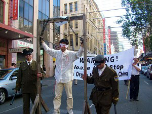 ![]() 游行队伍中模拟苏家屯集中营摘取活体器官的展示车 | ![]() 模拟苏家屯集中营关押法轮功学员 |